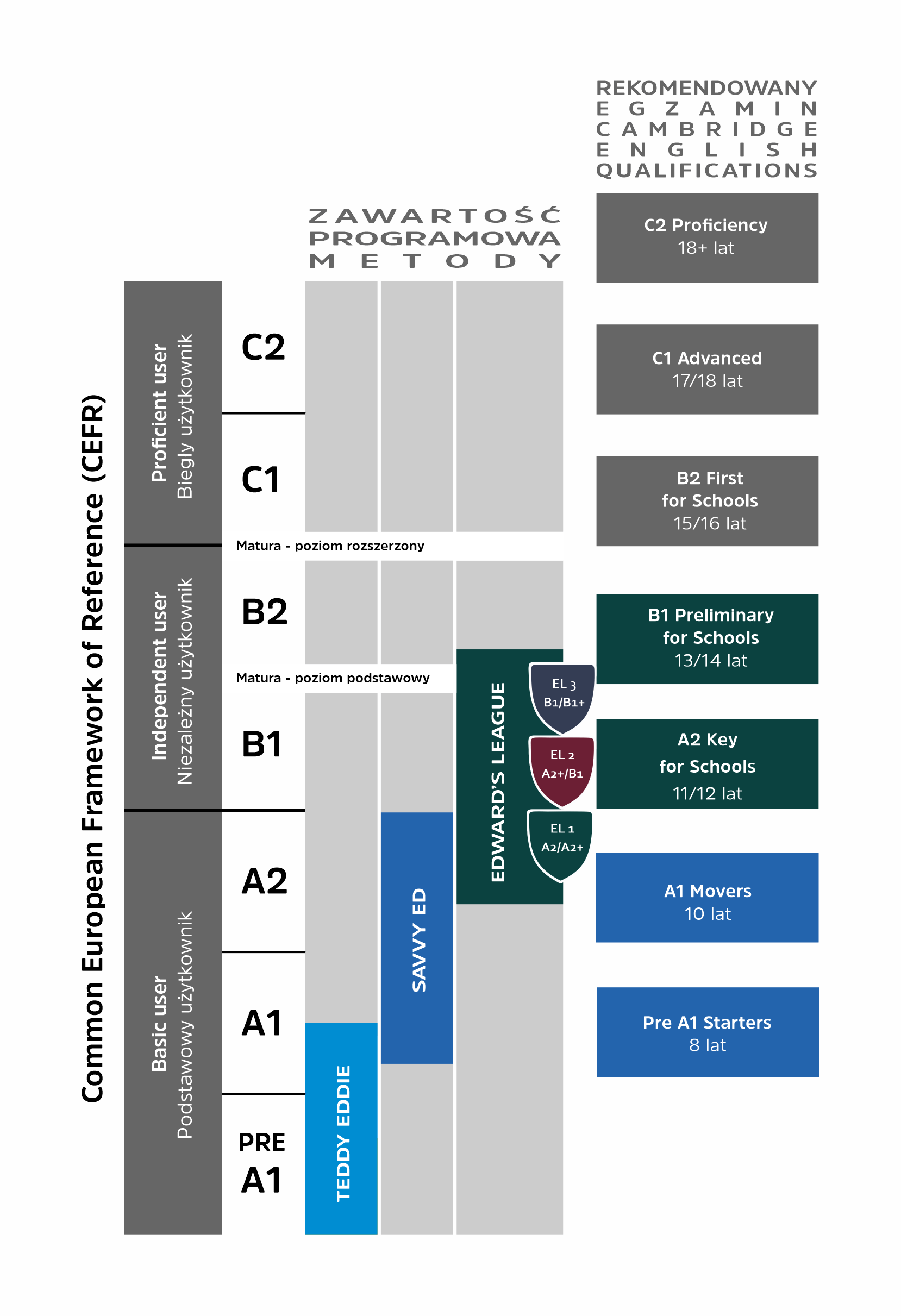Zakres materiału jest kompatybilny z egzaminami Cambridge English Qualifications. Na tym etapie warto stawiać uczniom cel w postaci międzynarodowego certyfikatu.